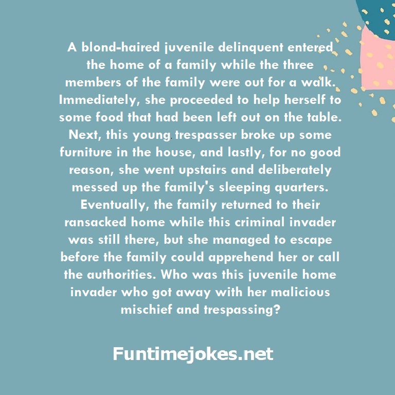 A blond-haired juvenile delinquent entered the home of a family while the three members of the family were out for a walk. Immediately, she proceeded to help herself to some food that had been left out on the table. Next, this young trespasser broke up some furniture in the house, and lastly, for no good reason, she went upstairs and deliberately messed up the family's sleeping quarters. Eventually, the family returned to their ransacked home while this criminal invader was still there, but she managed to escape before the family could apprehend her or call the authorities. Who was this juvenile home invader who got away with her malicious mischief and trespassing? is one of the best riddle of the day.We have best collections of riddles, You can see our best collection of Tricky Riddles with Answer