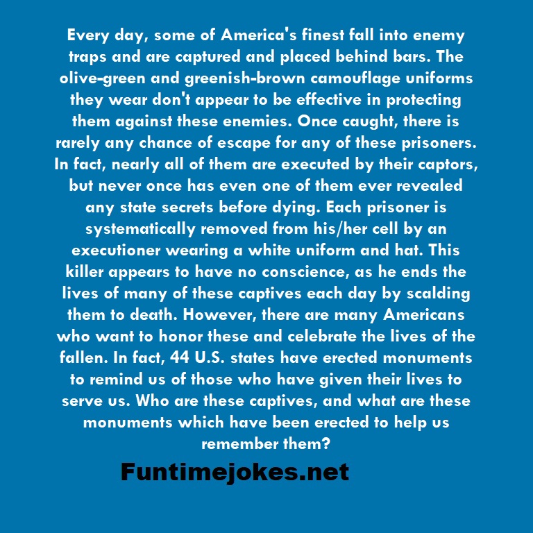 Every day, some of America's finest fall into enemy traps and are captured and placed behind bars. The olive-green and greenish-brown camouflage uniforms they wear don't appear to be effective in protecting them against these enemies. Once caught, there is rarely any chance of escape for any of these prisoners. In fact, nearly all of them are executed by their captors, but never once has even one of them ever revealed any state secrets before dying. Each prisoner is systematically removed from his/her cell by an executioner wearing a white uniform and hat. This killer appears to have no conscience, as he ends the lives of many of these captives each day by scalding them to death. However, there are many Americans who want to honor these and celebrate the lives of the fallen. In fact, 44 U.S. states have erected monuments to remind us of those who have given their lives to serve us. Who are these captives, and what are these monuments which have been erected to help us remember them? is one of the best riddle of the day.We have best collections of riddles, You can see our best collection of Tricky Riddles with Answer