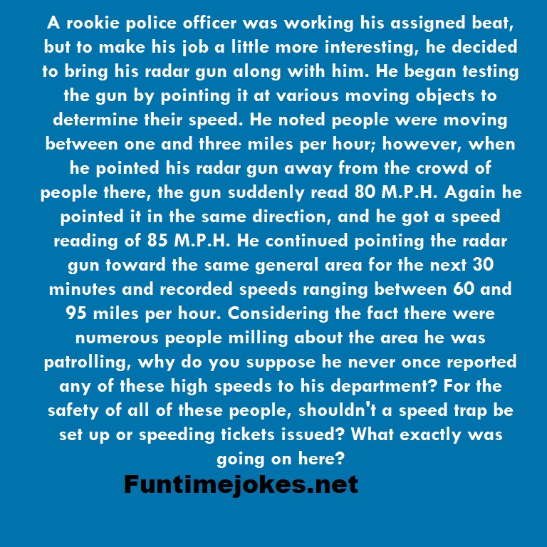 A rookie police officer was working his assigned beat, but to make his job a little more interesting, he decided to bring his radar gun along with him. He began testing the gun by pointing it at various moving objects to determine their speed. He noted people were moving between one and three miles per hour; however, when he pointed his radar gun away from the crowd of people there, the gun suddenly read 80 M.P.H. Again he pointed it in the same direction, and he got a speed reading of 85 M.P.H. He continued pointing the radar gun toward the same general area for the next 30 minutes and recorded speeds ranging between 60 and 95 miles per hour. Considering the fact there were numerous people milling about the area he was patrolling, why do you suppose he never once reported any of these high speeds to his department? For the safety of all of these people, shouldn't a speed trap be set up or speeding tickets issued? What exactly was going on here? is one of the best riddle of the day.We have best collections of riddles, You can see our best collection of Tricky Riddles with Answer