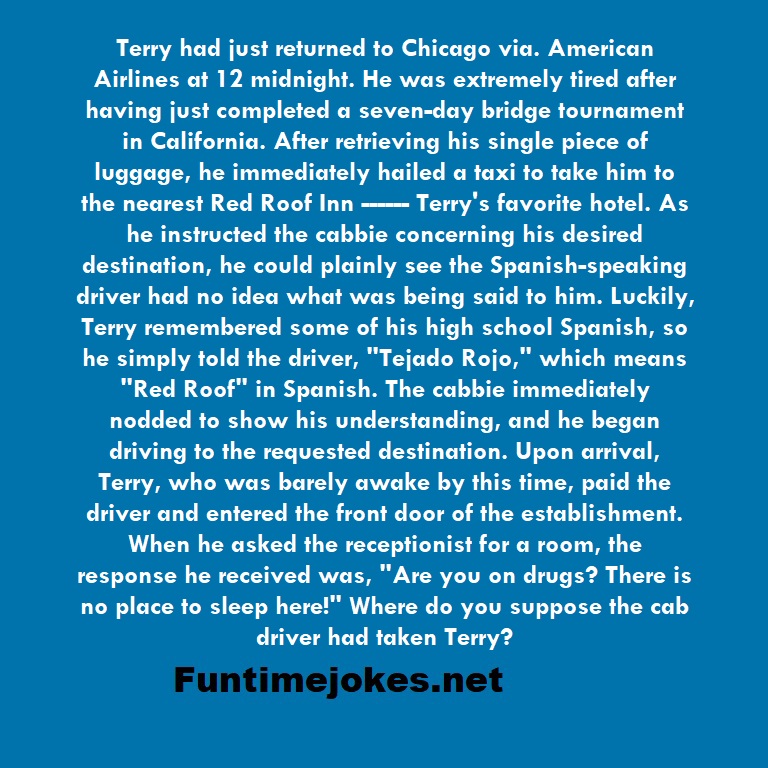 Terry had just returned to Chicago via. American Airlines at 12 midnight. He was extremely tired after having just completed a seven-day bridge tournament in California. After retrieving his single piece of luggage, he immediately hailed a taxi to take him to the nearest Red Roof Inn ------ Terry's favorite hotel. As he instructed the cabbie concerning his desired destination, he could plainly see the Spanish-speaking driver had no idea what was being said to him. Luckily, Terry remembered some of his high school Spanish, so he simply told the driver, "Tejado Rojo," which means "Red Roof" in Spanish. The cabbie immediately nodded to show his understanding, and he began driving to the requested destination. Upon arrival, Terry, who was barely awake by this time, paid the driver and entered the front door of the establishment. When he asked the receptionist for a room, the response he received was, "Are you on drugs? There is no place to sleep here!" Where do you suppose the cab driver had taken Terry? is one of the best riddle of the day.We have best collections of riddles, You can see our best collection of Tricky Riddles with Answer
