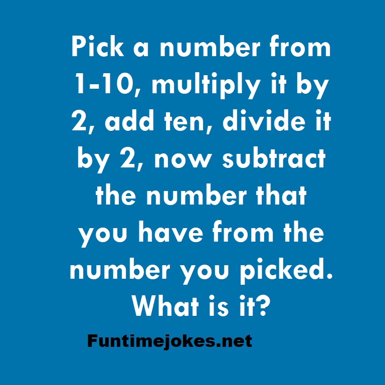 Pick a number from 1-10, multiply it by 2, add ten, divide it by 2, now subtract the number that you have from the number you picked. What is it? is one of the best riddle of the day.We have best collections of riddles, You can see our best collection of Tricky Riddles with Answer