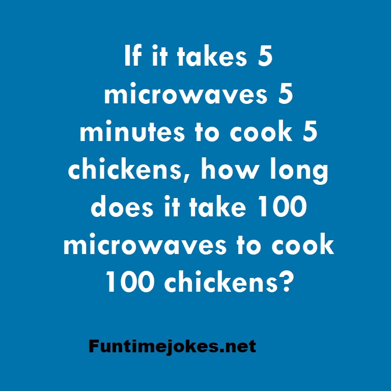 If it takes 5 microwaves 5 minutes to cook 5 chickens, how long does it take 100 microwaves to cook 100 chickens? is one of the best riddle of the day.We have best collections of riddles, You can see our best collection of Tricky Riddles with Answer