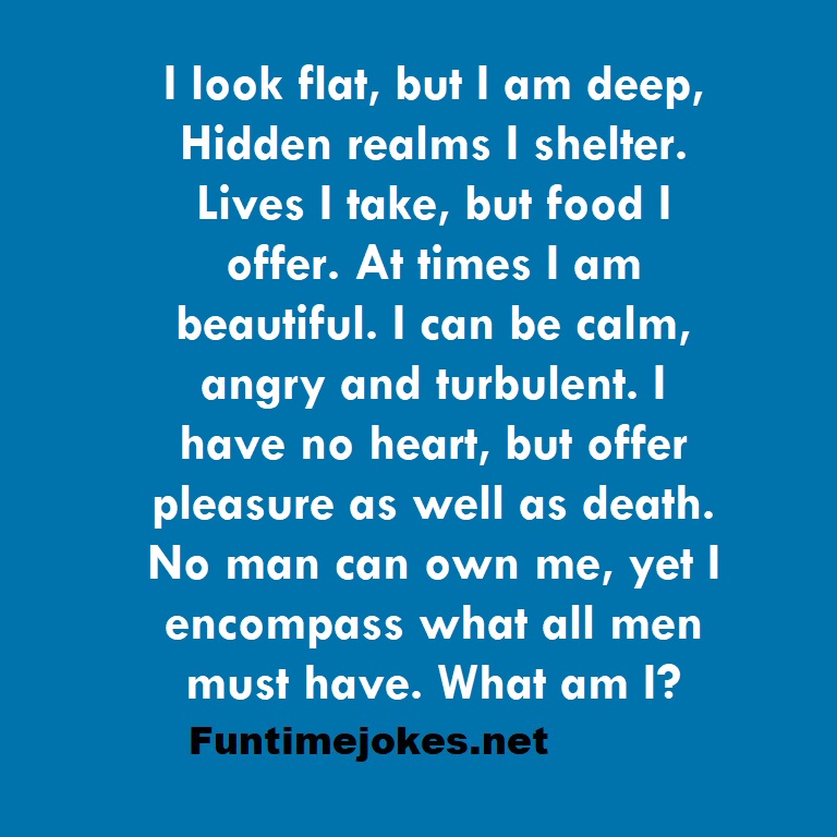 I look flat, but I am deep, Hidden realms I shelter. Lives I take, but food I offer. At times I am beautiful. I can be calm, angry and turbulent. I have no heart, but offer pleasure as well as death. No man can own me, yet I encompass what all men must have. What am I? is one of the best riddle of the day.We have best collections of riddles, You can see our best collection of Tricky Riddles with Answer