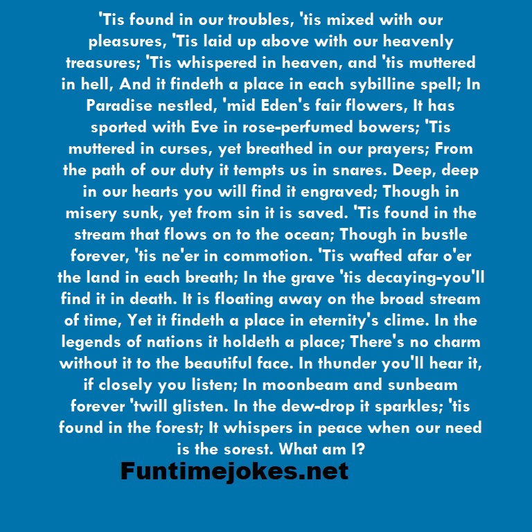 'Tis found in our troubles, 'tis mixed with our pleasures, 'Tis laid up above with our heavenly treasures; 'Tis whispered in heaven, and 'tis muttered in hell, And it findeth a place in each sybilline spell; In Paradise nestled, 'mid Eden's fair flowers, It has sported with Eve in rose-perfumed bowers; 'Tis muttered in curses, yet breathed in our prayers; From the path of our duty it tempts us in snares. Deep, deep in our hearts you will find it engraved; Though in misery sunk, yet from sin it is saved. 'Tis found in the stream that flows on to the ocean; Though in bustle forever, 'tis ne'er in commotion. 'Tis wafted afar o'er the land in each breath; In the grave 'tis decaying-you'll find it in death. It is floating away on the broad stream of time, Yet it findeth a place in eternity's clime. In the legends of nations it holdeth a place; There's no charm without it to the beautiful face. In thunder you'll hear it, if closely you listen; In moonbeam and sunbeam forever 'twill glisten. In the dew-drop it sparkles; 'tis found in the forest; It whispers in peace when our need is the sorest. What am I? is one of the best riddle of the day.We have best collections of riddles, You can see our best collection of Tricky Riddles with Answer