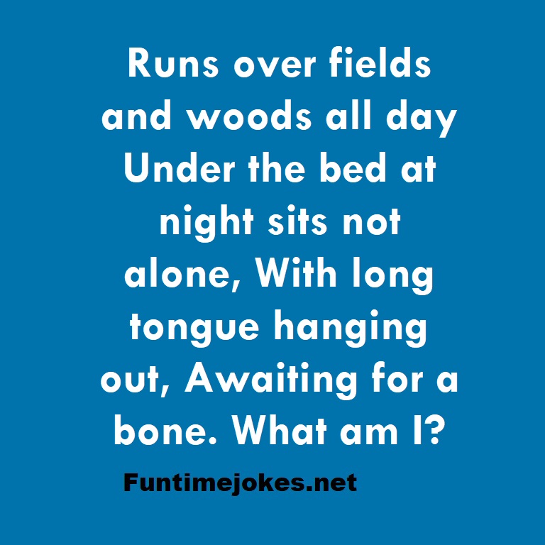 Runs over fields and woods all day Under the bed at night sits not alone, With long tongue hanging out, Awaiting for a bone. What am I? is one of the best riddle of the day.We have best collections of riddles, You can see our best collection of Tricky Riddles with Answer
