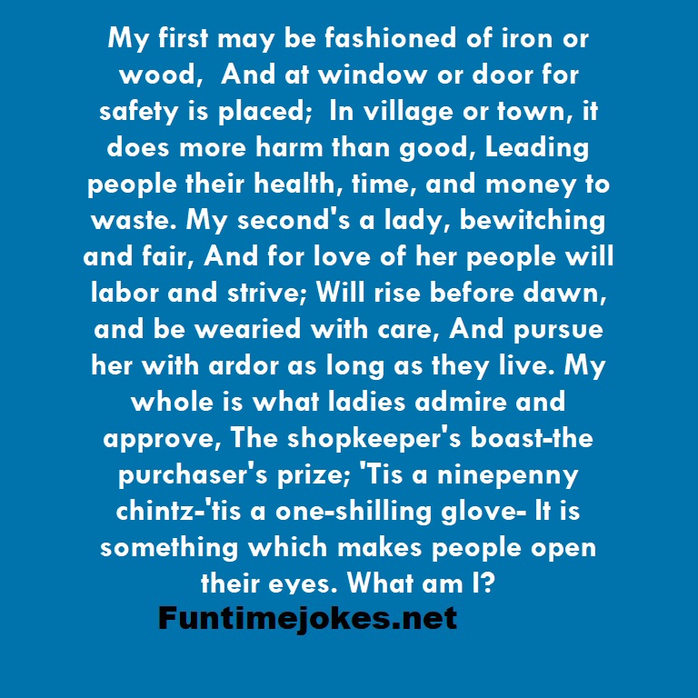 My first may be fashioned of iron or wood, And at window or door for safety is placed; In village or town, it does more harm than good, Leading people their health, time, and money to waste. My second's a lady, bewitching and fair, And for love of her people will labor and strive; Will rise before dawn, and be wearied with care, And pursue her with ardor as long as they live. My whole is what ladies admire and approve, The shopkeeper's boast-the purchaser's prize; 'Tis a ninepenny chintz-'tis a one-shilling glove- It is something which makes people open their eyes. What am I? is one of the best riddle of the day.We have best collections of riddles, You can see our best collection of Tricky Riddles with Answer Funtimejokes be the be the world's most knowledge able riddle website on the internet for riddles, puzzles, rebus caps and quizzes. Our riddle library has interesting riddles and answers to riddles for adults and evoke deep thought and community discussion. Riddlers will benefit from the creativity of our members who participate in growth of our online riddles and puzzles resource. We encourage you to become a member of Riddles and receive daily/weekly free riddles email.