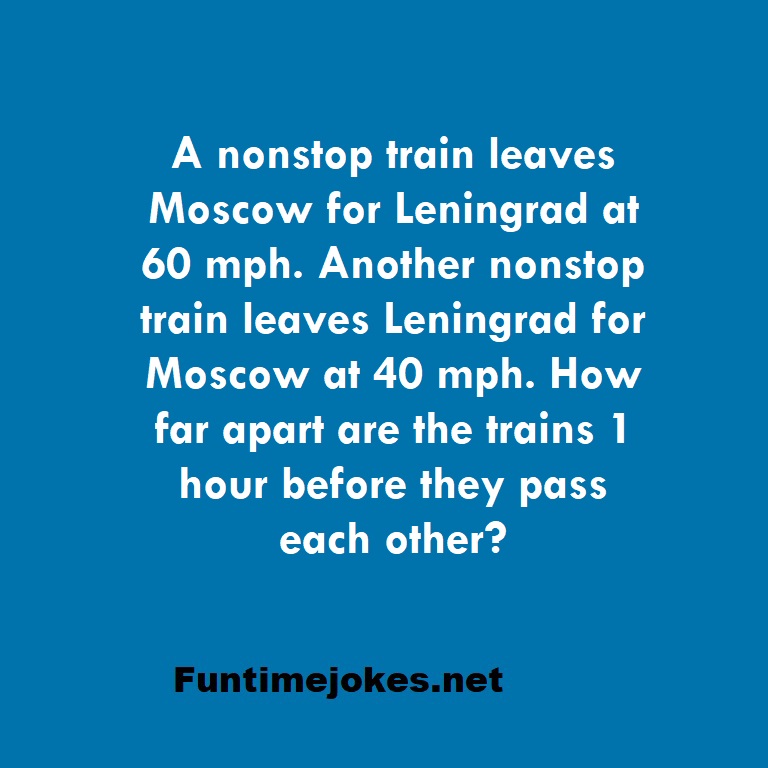A nonstop train leaves Moscow for Leningrad at 60 mph. Another nonstop train leaves Leningrad for Moscow at 40 mph. How far apart are the trains 1 hour before they pass each other? is one of the best riddle of the day.We have best collections of riddles, You can see our best collection of Tricky Riddles with Answer