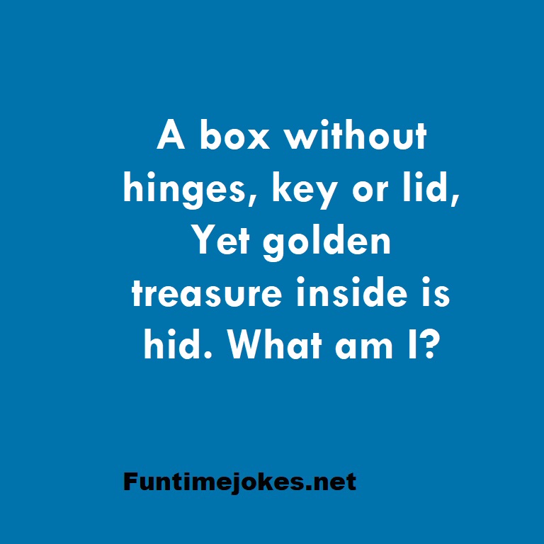 A box without hinges, key or lid, Yet golden treasure inside is hid. What am I? is one of the best riddle of the day.We have best collections of riddles, You can see our best collection of Tricky Riddles with Answer