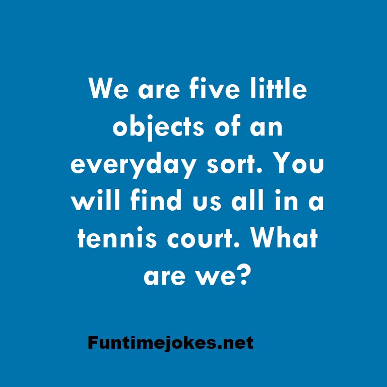 We are five little objects of an everyday sort. You will find us all in a tennis court. What are we? is one of the best riddle of the day.We have best collections of riddles, You can see our best collection of Tricky Riddles with Answer