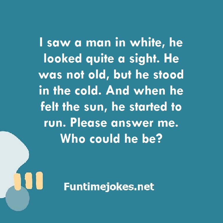 I saw a man in white, he looked quite a sight. He was not old, but he stood in the cold. And when he felt the sun, he started to run. Please answer me. Who could he be? is one of the best riddle of the day.We have best collections of riddles, You can see our best collection of Tricky Riddles with Answer