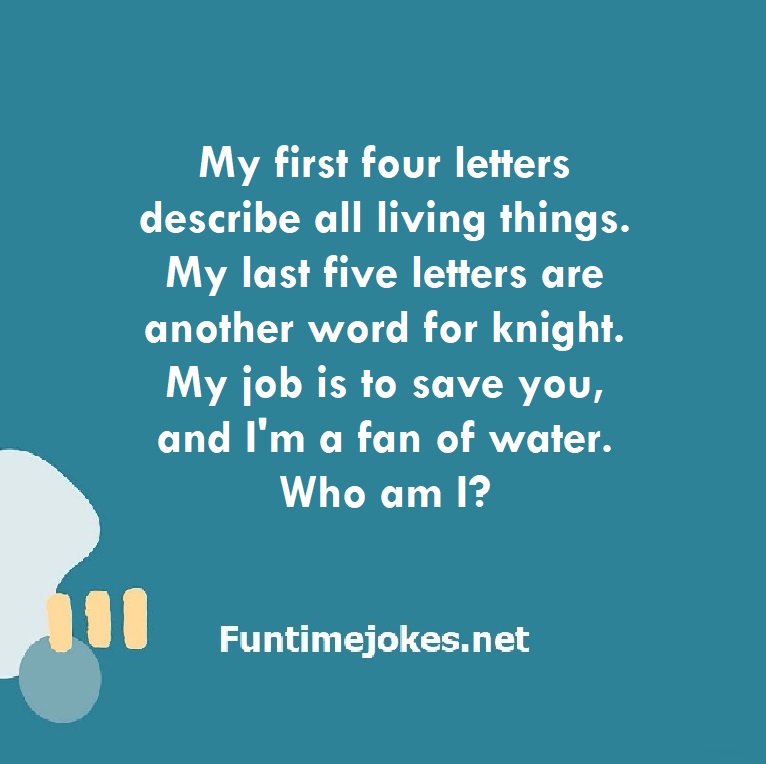 My first four letters describe all living things. My last five letters are another word for knight. My job is to save you, and I'm a fan of water. Who am I? is one of the best riddle of the day.We have best collections of riddles, You can see our best collection of Tricky Riddles with Answer