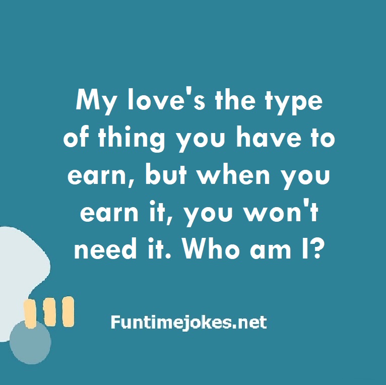 My love's the type of thing you have to earn, but when you earn it, you won't need it. Who am I? is one of the best riddle of the day.We have best collections of riddles, You can see our best collection of Tricky Riddles with Answer