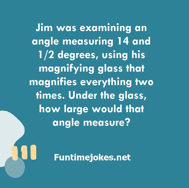 Jim was examining an angle measuring 14 and 1/2 degrees, using his magnifying glass that magnifies everything two times. Under the glass, how large would that angle measure? is one of the best riddle of the day.We have best collections of riddles, You can see our best collection of Tricky Riddles with Answer