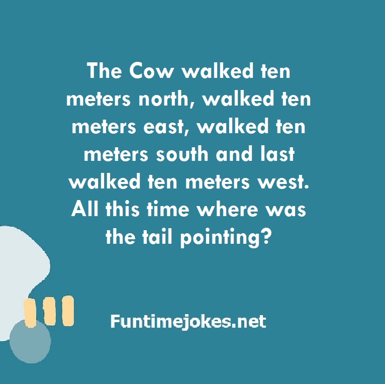 The Cow walked ten meters north, walked ten meters east, walked ten meters south and last walked ten meters west. All this time where was the tail pointing? is one of the best riddle of the day.We have best collections of riddles, You can see our best collection of Tricky Riddles with Answer