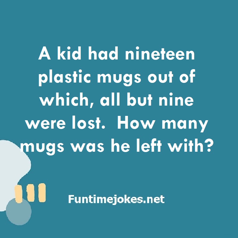 A kid had nineteen plastic mugs out of which, all but nine were lost. How many mugs was he left with? is one of the best riddle of the day.We have best collections of riddles, You can see our best collection of Tricky Riddles with Answer