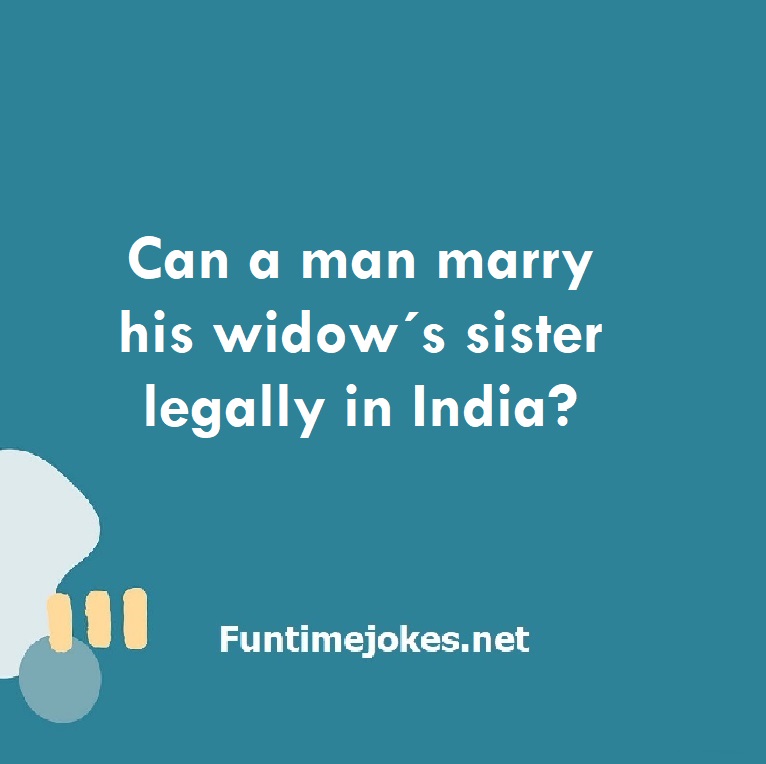 Can a man marry his widow"s sister legally in India? is one of the best riddle of the day.We have best collections of riddles, You can see our best collection of Tricky Riddles with Answer Funtimejokes be the be the world's most knowledge able riddle website on the internet for riddles, puzzles, rebus caps and quizzes. Our riddle library has interesting riddles and answers to riddles for adults and evoke deep thought and community discussion. Riddlers will benefit from the creativity of our members who participate in growth of our online riddles and puzzles resource. We encourage you to become a member of Riddles and receive daily/weekly free riddles email.