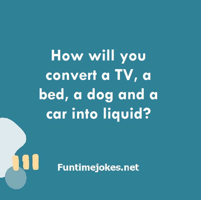 How will you convert a TV, a bed, a dog and a car into liquid? is one of the best riddle of the day.We have best collections of riddles, You can see our best collection of Tricky Riddles with Answer