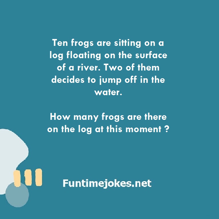Ten frogs are sitting on a log floating on the surface of a river. Two of them decides to jump off in the water. How many frogs are there on the log at this moment ? is one of the best riddle of the day.We have best collections of riddles, You can see our best collection of Tricky Riddles with Answer