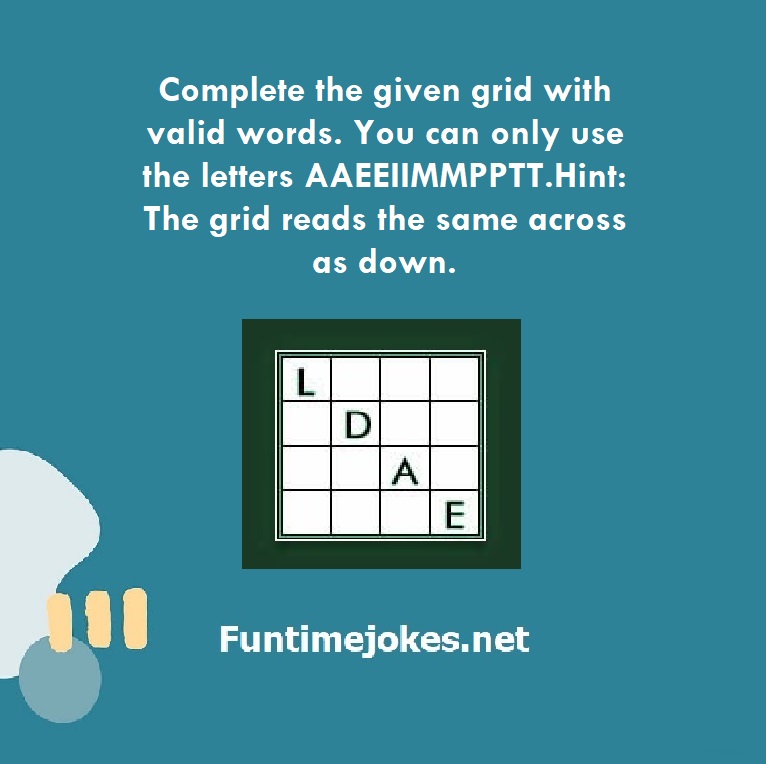 Complete the given grid with valid words. You can only use the letters AAEEIIMMPPTT.Hint: The grid reads the same across as down. is one of the best riddle of the day.We have best collections of riddles, You can see our best collection of Tricky Riddles with Answer