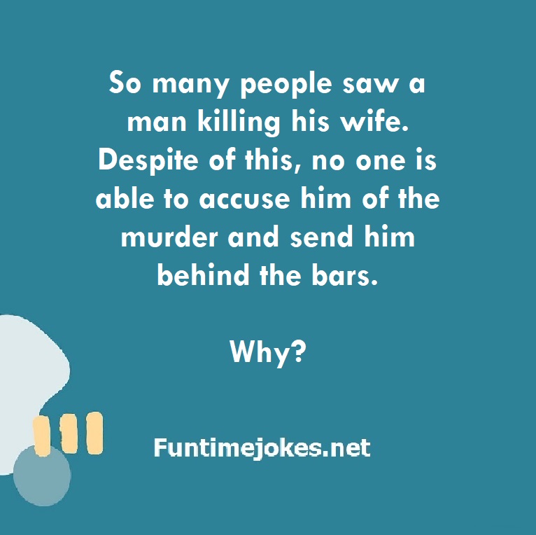 So many people saw a man killing his wife. Despite of this, no one is able to accuse him of the murder and send him behind the bars. Why? is one of the best riddle of the day.We have best collections of riddles, You can see our best collection of Tricky Riddles with Answer