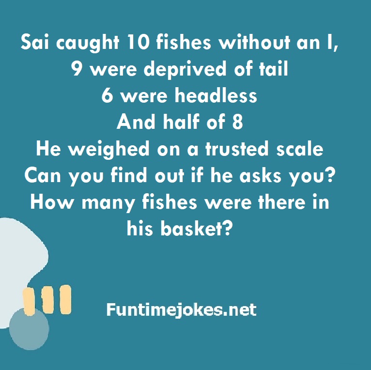 Sai caught 10 fishes without an I, 9 were deprived of tail 6 were headless And half of 8 He weighed on a trusted scale Can you find out if he asks you? How many fishes were there in his basket? is one of the best riddle of the day.We have best collections of riddles, You can see our best collection of Tricky Riddles with Answer