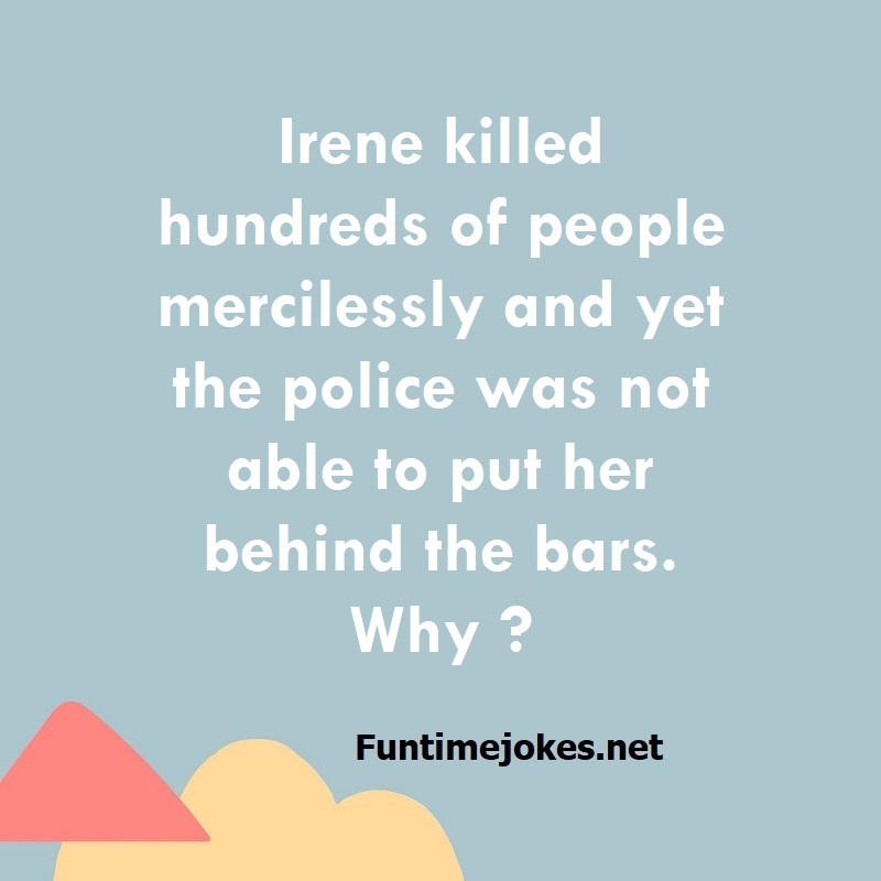 Irene killed hundreds of people mercilessly and yet the police was not able to put her behind the bars. Why ? is one of the best riddle of the day.We have best collections of riddles, You can see our best collection of Tricky Riddles with Answer