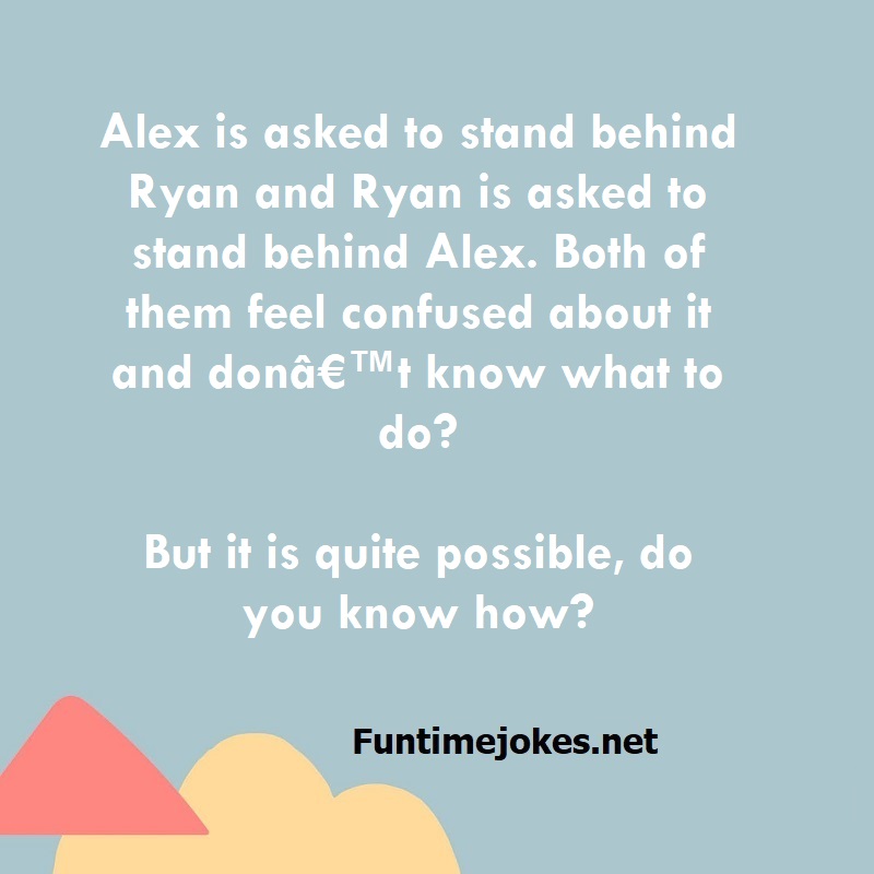 Alex is asked to stand behind Ryan and Ryan is asked to stand behind Alex. Both of them feel confused about it and don’t know what to do? But it is quite possible, do you know how? is one of the best riddle of the day.We have best collections of riddles, You can see our best collection of Tricky Riddles with Answer