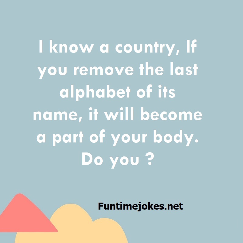 I know a country, If you remove the last alphabet of its name, it will become a part of your body. Do you ? is one of the best riddle of the day.We have best collections of riddles, You can see our best collection of Tricky Riddles with Answer