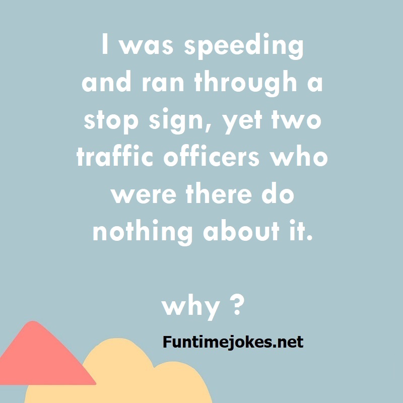 I was speeding and ran through a stop sign, yet two traffic officers who were there do nothing about it. why ? is one of the best riddle of the day.We have best collections of riddles, You can see our best collection of Tricky Riddles with Answer