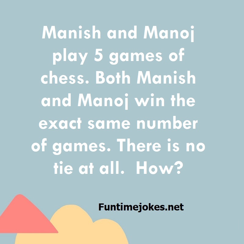 Manish and Manoj play 5 games of chess. Both Manish and Manoj win the exact same number of games. There is no tie at all. How? is one of the best riddle of the day.We have best collections of riddles, You can see our best collection of Tricky Riddles with Answer