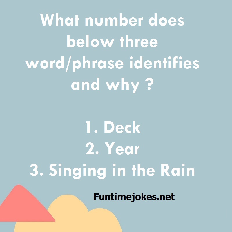 What number does below three word/phrase identifies and why ? 1. Deck 2. Year 3. Singing in the Rain is one of the best riddle of the day.We have best collections of riddles, You can see our best collection of Tricky Riddles with Answer