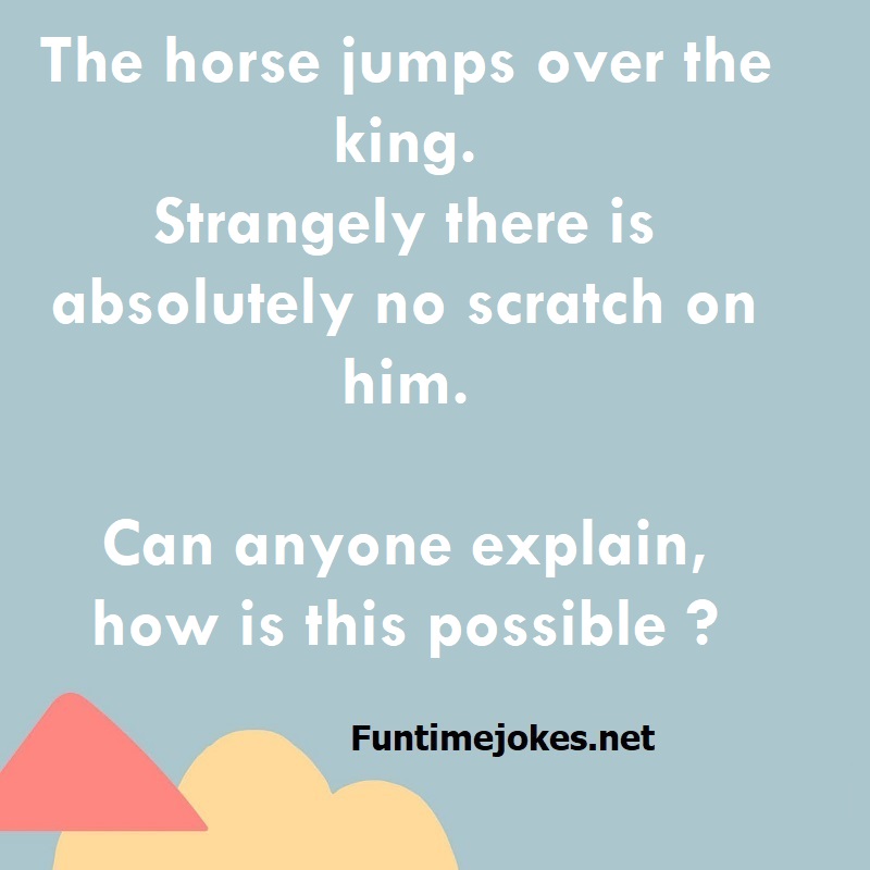 The horse jumps over the king. Strangely there is absolutely no scratch on him. Can anyone explain, how is this possible ? is one of the best riddle of the day.We have best collections of riddles, You can see our best collection of Tricky Riddles with Answer