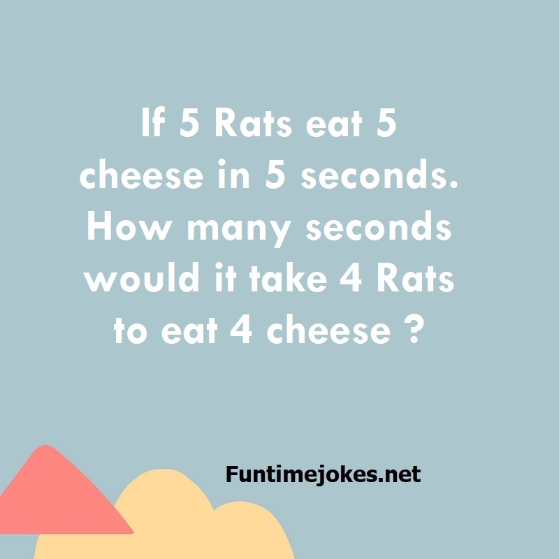 If 5 Rats eat 5 cheese in 5 seconds. How many seconds would it take 4 Rats to eat 4 cheese ? is one of the best riddle of the day.We have best collections of riddles, You can see our best collection of Tricky Riddles with Answer