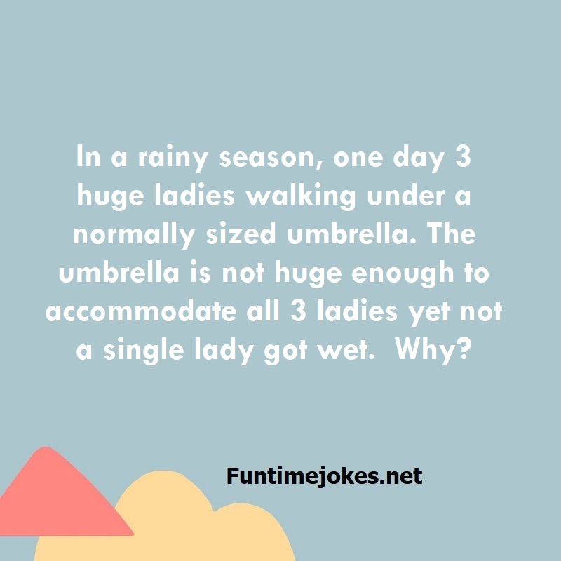 In a rainy season, one day 3 huge ladies walking under a normally sized umbrella. The umbrella is not huge enough to accommodate all 3 ladies yet not a single lady got wet. Why? is one of the best riddle of the day.We have best collections of riddles, You can see our best collection of Tricky Riddles with Answer