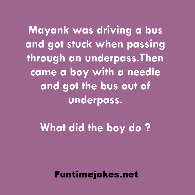Mayank was driving a bus and got stuck when passing through an underpass.Then came a boy with a needle and got the bus out of underpass. What did the boy do ? is one of the best riddle of the day.We have best collections of riddles, You can see our best collection of Tricky Riddles with Answer