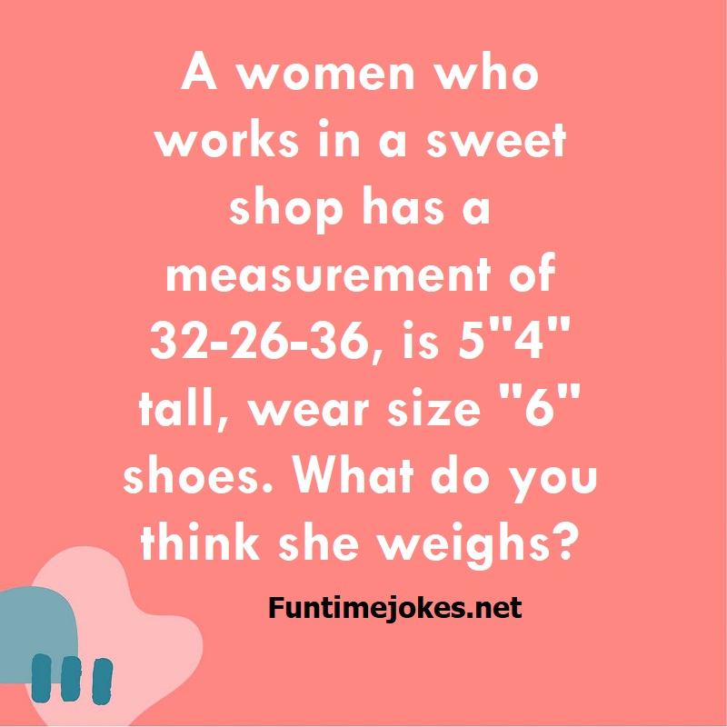 A women who works in a sweet shop has a measurement of 32-26-36, is 5"4" tall, wear size "6" shoes. What do you think she weighs? is one of the best riddle of the day.We have best collections of riddles, You can see our best collection of Tricky Riddles with Answer Funtimejokes be the be the world's most knowledge able riddle website on the internet for riddles, puzzles, rebus caps and quizzes. Our riddle library has interesting riddles and answers to riddles for adults and evoke deep thought and community discussion. Riddlers will benefit from the creativity of our members who participate in growth of our online riddles and puzzles resource. We encourage you to become a member of Riddles and receive daily/weekly free riddles email.