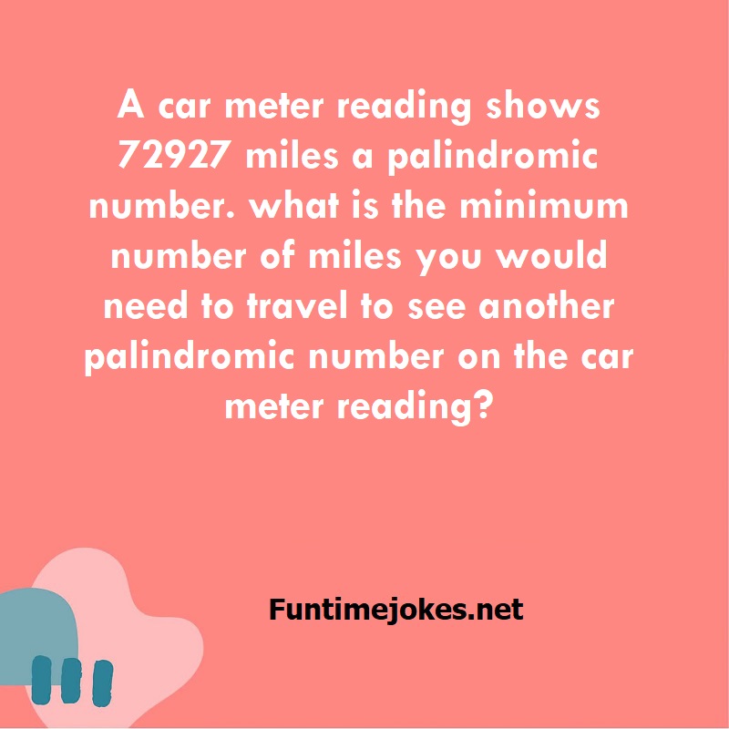 A car meter reading shows 72927 miles a palindromic number. what is the minimum number of miles you would need to travel to see another palindromic number on the car meter reading? is one of the best riddle of the day.We have best collections of riddles, You can see our best collection of Tricky Riddles with Answer