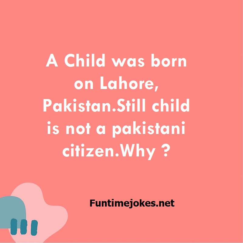 A Child was born on Lahore, Pakistan.Still child is not a pakistani citizen.why ? is one of the best riddle of the day.We have best collections of riddles, You can see our best collection of Tricky Riddles with Answer