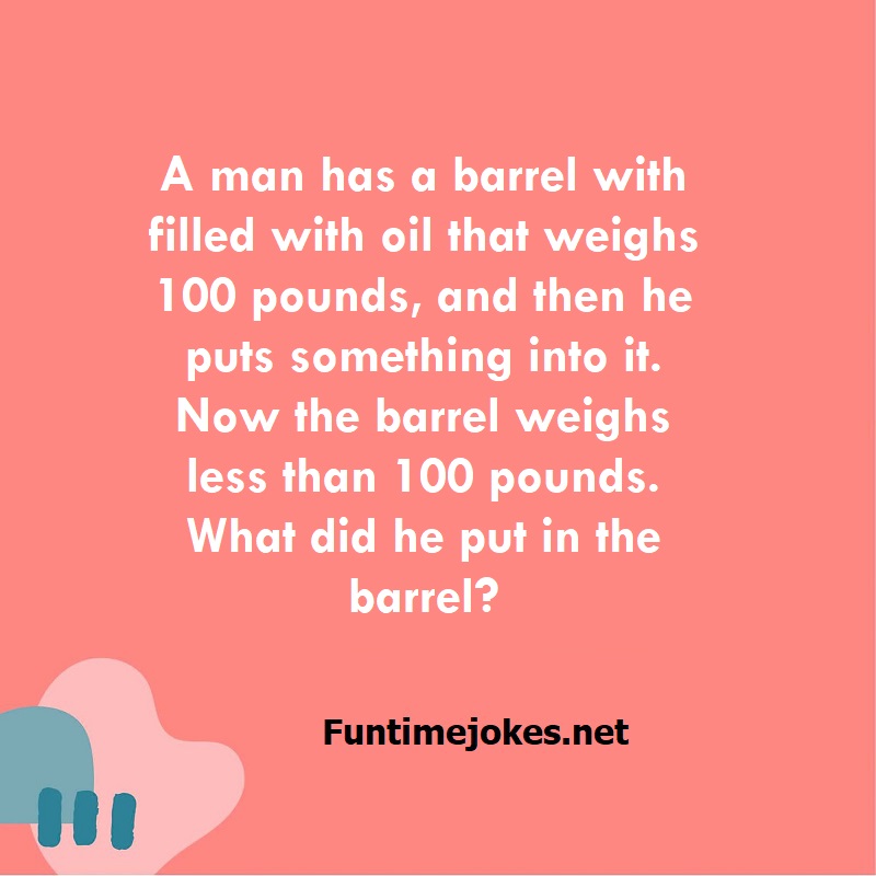 A man has a barrel with filled with oil that weighs 100 pounds, and then he puts something into it. Now the barrel weighs less than 100 pounds. What did he put in the barrel? is one of the best riddle of the day.We have best collections of riddles, You can see our best collection of Tricky Riddles with Answer