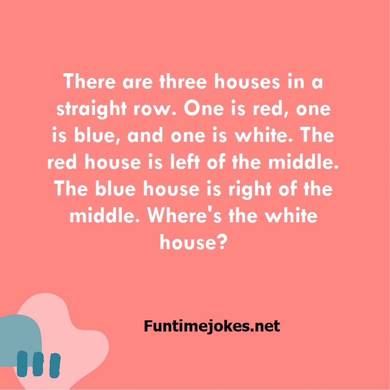 There are three houses in a straight row. One is red, one is blue, and one is white. The red house is left of the middle. The blue house is right of the middle. Where's the white house? is one of the best riddle of the day.We have best collections of riddles, You can see our best collection of Tricky Riddles with Answer
