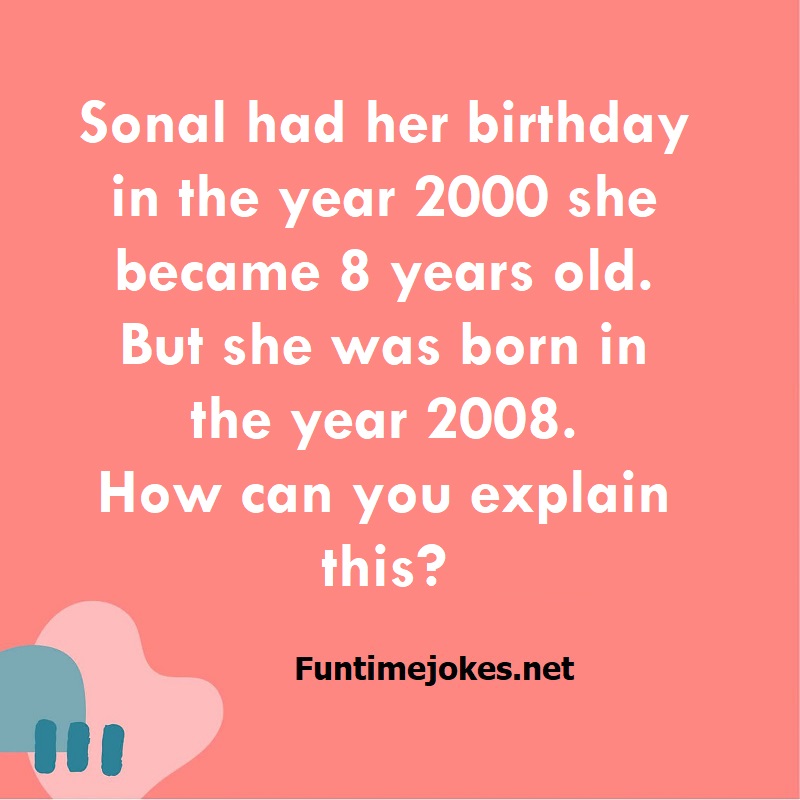 Sonal had her birthday in the year 2000 she became 8 years old. But she was born in the year 2008. How can you explain this? is one of the best riddle of the day.We have best collections of riddles, You can see our best collection of Tricky Riddles with Answer