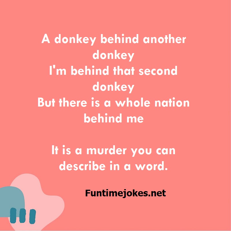 A donkey behind another donkey I'm behind that second donkey But there is a whole nation behind me It is a murder you can describe in a word. is one of the best riddle of the day.We have best collections of riddles, You can see our best collection of Tricky Riddles with Answer