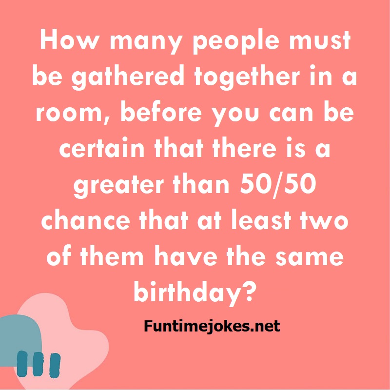 How many people must be gathered together in a room, before you can be certain that there is a greater than 50/50 chance that at least two of them have the same birthday? is one of the best riddle of the day.We have best collections of riddles, You can see our best collection of Tricky Riddles with Answer