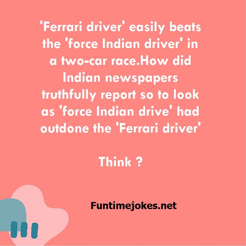 'Ferrari driver' easily beats the 'force Indian driver' in a two-car race.How did Indian newspapers truthfully report so to look as 'force Indian drive' had outdone the 'Ferrari driver' Think ? is one of the best riddle of the day.We have best collections of riddles, You can see our best collection of Tricky Riddles with Answer