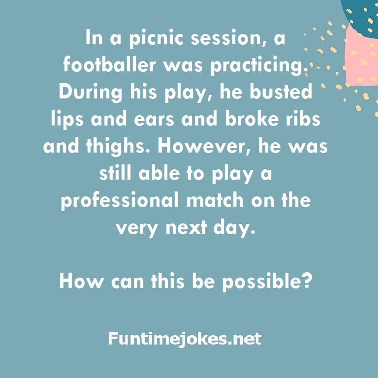In a picnic session, a footballer was practicing. During his play, he busted lips and ears and broke ribs and thighs. However, he was still able to play a professional match on the very next day. How can this be possible? is one of the best riddle of the day.We have best collections of riddles, You can see our best collection of Tricky Riddles with Answer