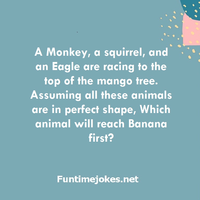 A Monkey, a squirrel, and an Eagle are racing to the top of the mango tree. Assuming all these animals are in perfect shape, Which animal will reach Banana first? is one of the best riddle of the day.We have best collections of riddles, You can see our best collection of Tricky Riddles with Answer