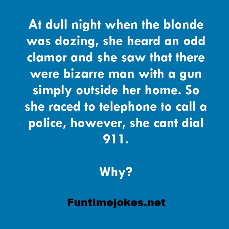 At dull night when the blonde was dozing, she heard an odd clamor and she saw that there were bizarre man with a gun simply outside her home. So she raced to telephone to call a police, however, she cant dial 911. Why? is one of the best riddle of the day.We have best collections of riddles, You can see our best collection of Tricky Riddles with Answer