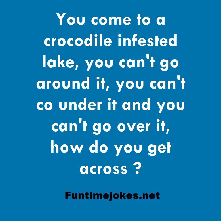 You come to a crocodile infested lake, you can't go around it, you can't co under it and you can't go over it, how do you get across ? is one of the best riddle of the day.We have best collections of riddles, You can see our best collection of Tricky Riddles with Answer