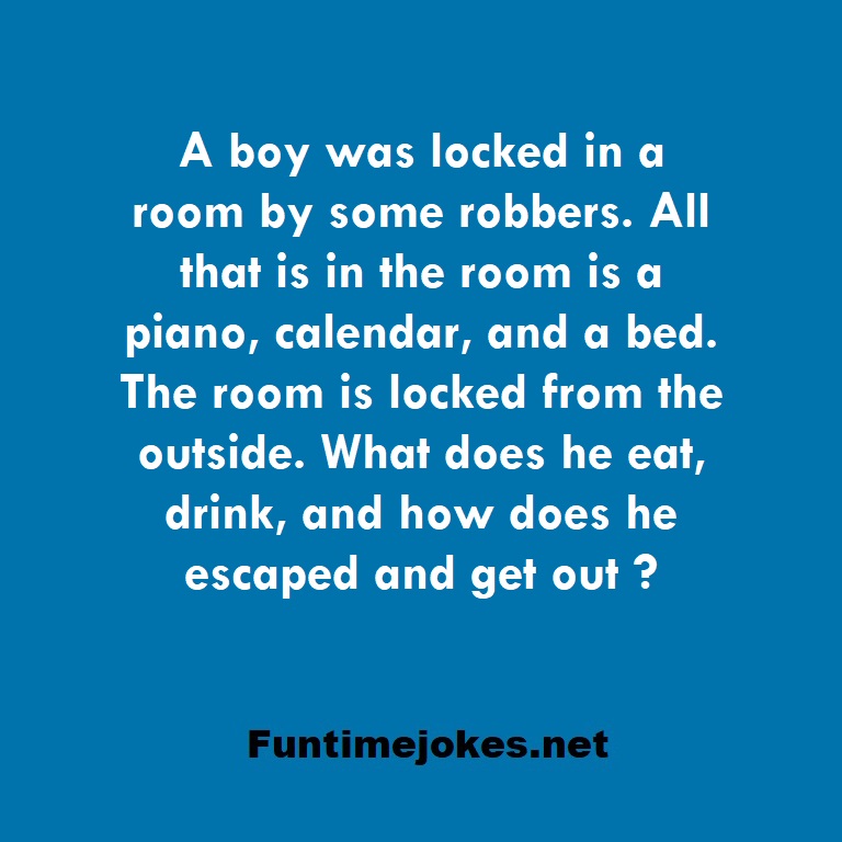A boy was locked in a room by some robbers. All that is in the room is a piano, calendar, and a bed. The room is locked from the outside. What does he eat, drink, and how does he escaped and get out ? is one of the best riddle of the day.We have best collections of riddles, You can see our best collection of Tricky Riddles with Answer