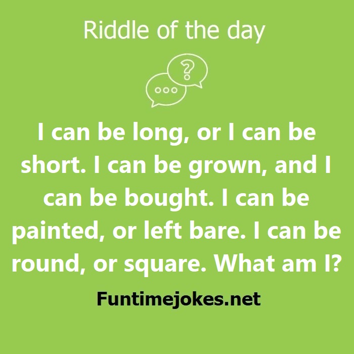 π Pop Balloon Riddles (Tap to reveal answers)I can be long, or I can be short. I can be grown, and I can be bought. I can be painted, or left bare. I can be round, or square. What am I? is one of the best riddle of the day.We have best collections of riddles, You can see our best collection of Tricky Riddles with Answer